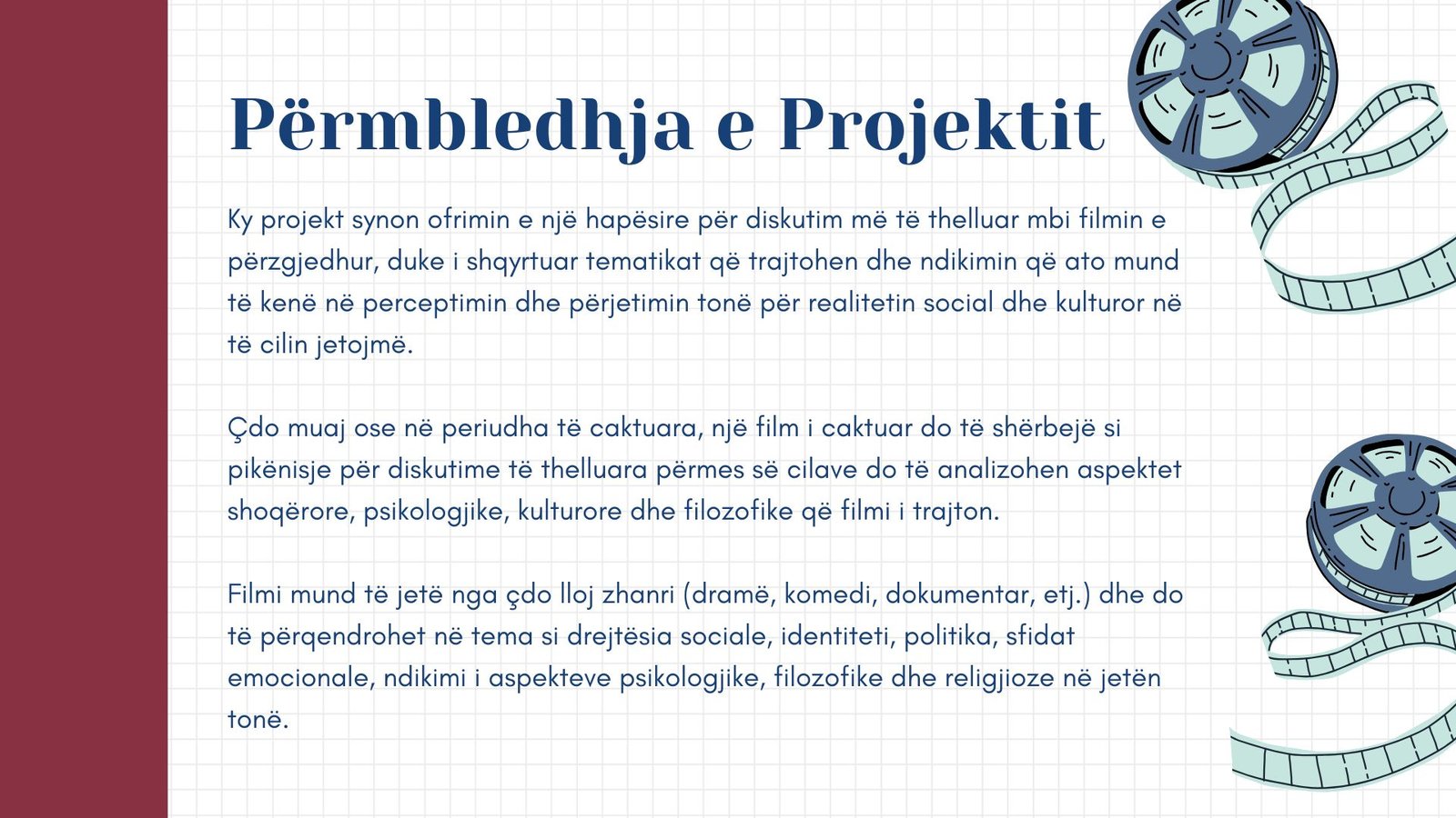 Ky projekt krijon një hapësirë të rregullt për diskutime mbi filmin, duke eksploruar temat e tij dhe ndikimin në mënyrën si e kuptojmë realitetin social dhe kulturor. Çdo muaj do të përzgjedhim një film, i cili do të shërbejë si platformë për diskutime të thelluara mbi çështje sociale, psikologjike, kulturore dhe filozofike.