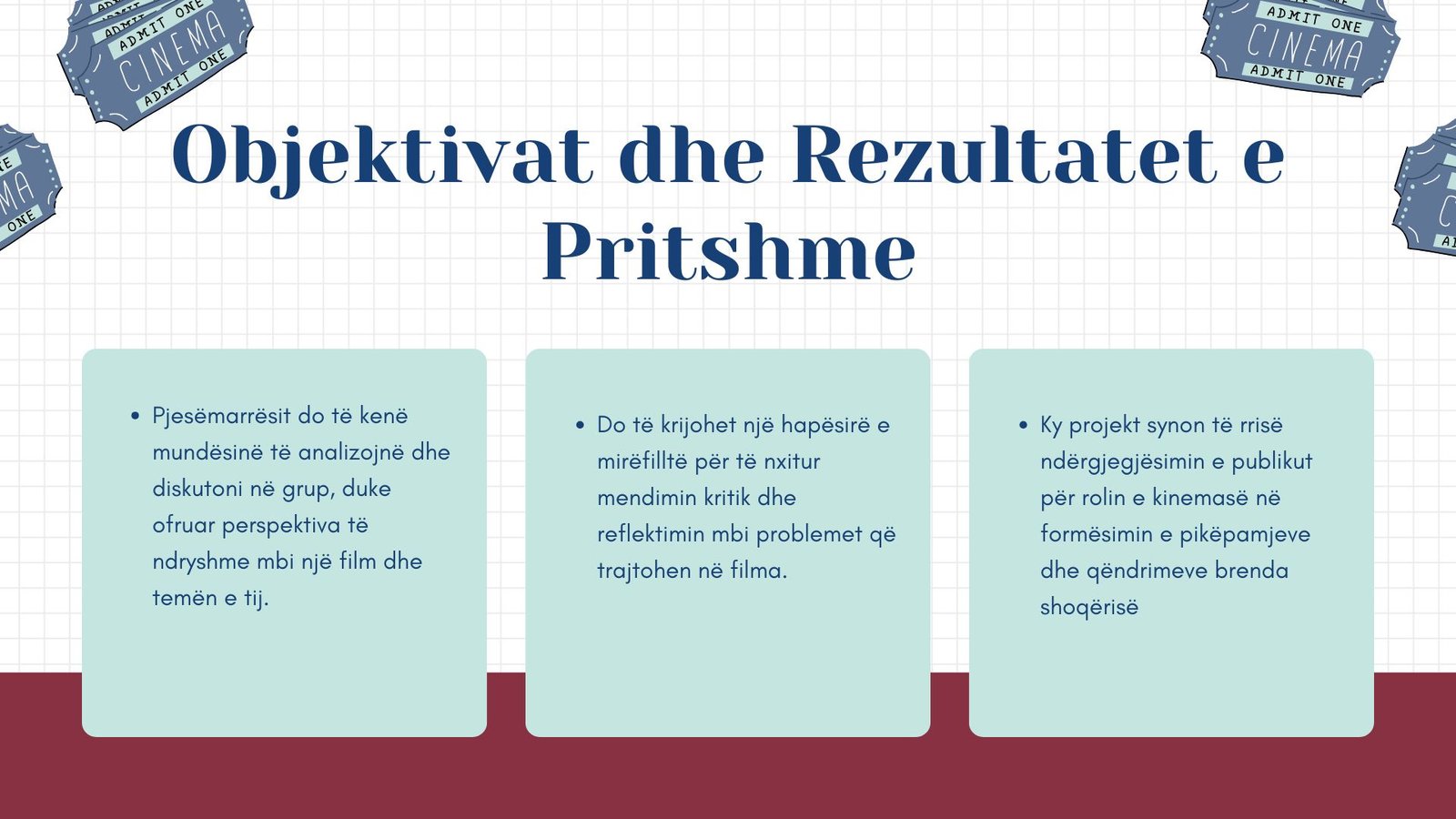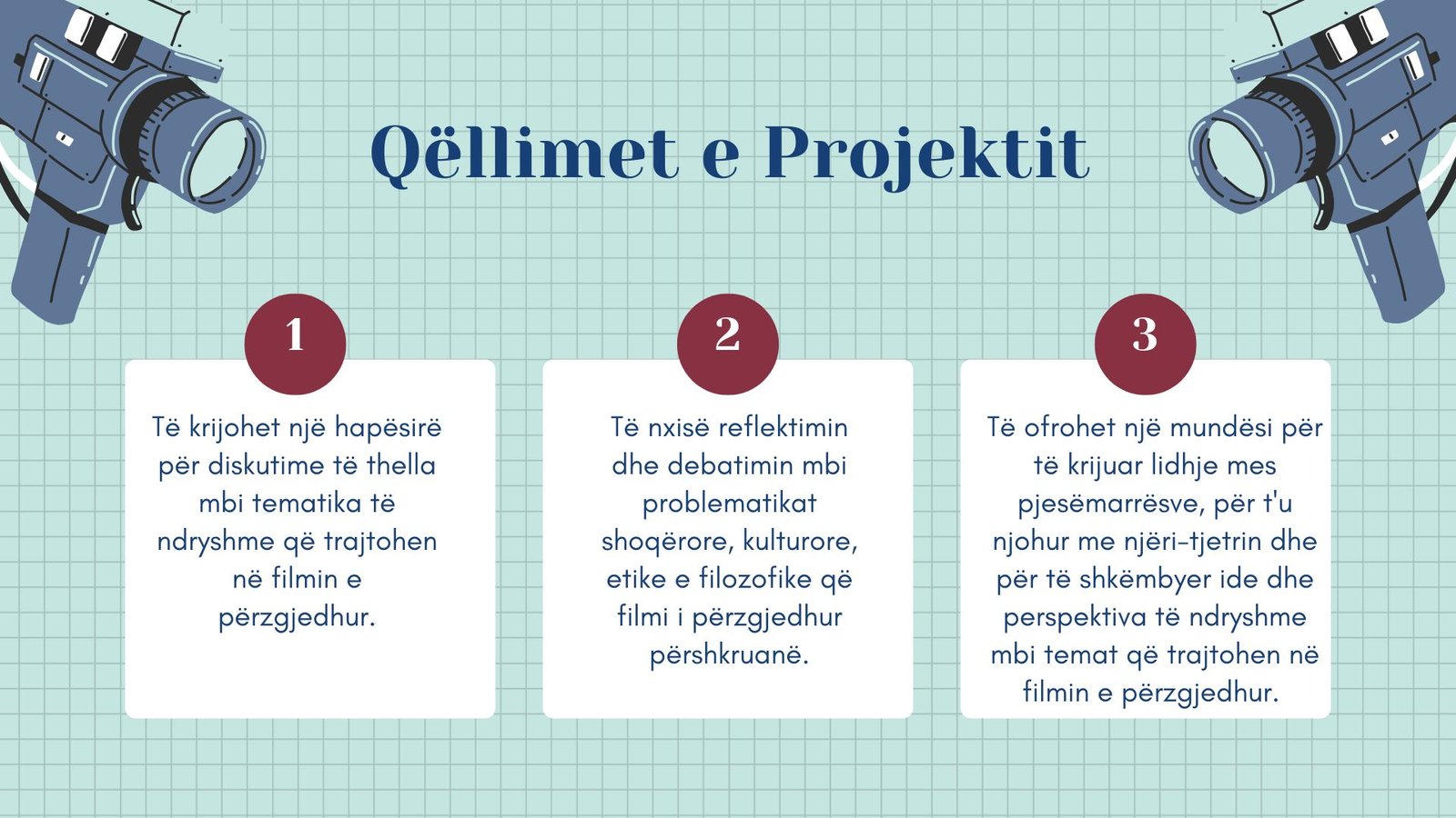 Qëllimi ynë është të nxisim lexim kritik të filmit si vepër arti dhe si dokument i kohës, të hapim biseda të informuara dhe të ndërthurim qasje teorike me shembuj konkretë nga kinematografia.