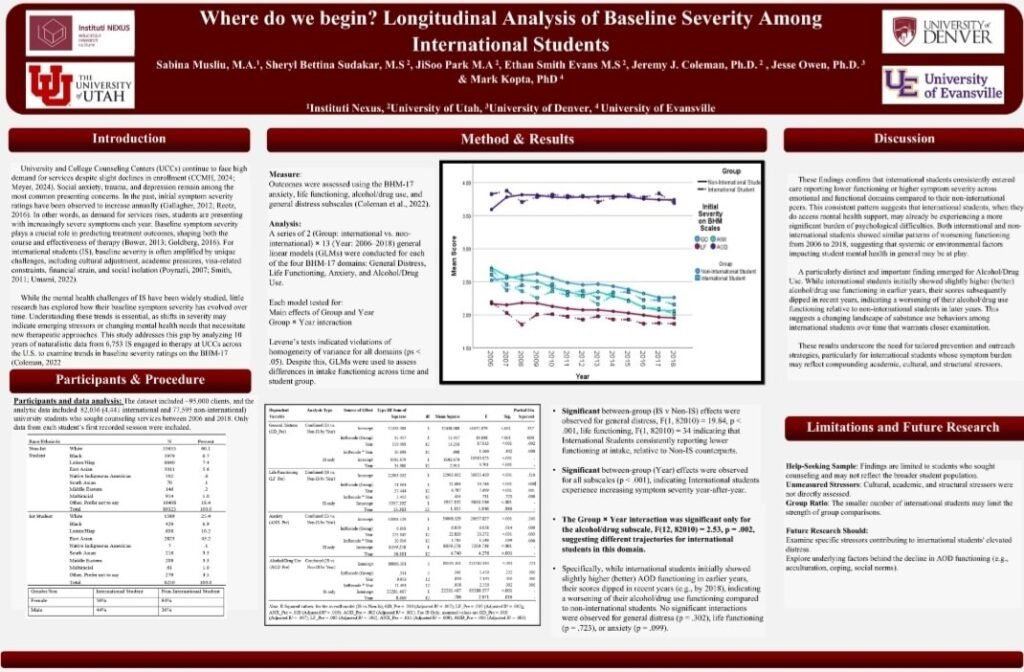 Dy projekte, në të cilat Sabina Musliu nga ekipi ynë bashkëpunoi ngushtë me kolegë nga University of Utah dhe University of Denver, u paraqitën në format posteri. Këto prezantime sollën ide të reja dhe ndezën biseda të vlefshme mbi psikologjinë dhe shëndetin mendor me profesionistë nga mbarë bota.
